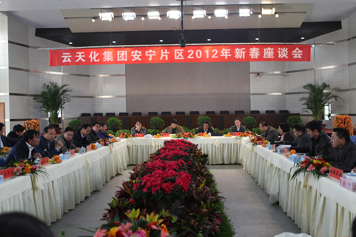 1月10日的天安化工报告厅洋溢着浓郁的喜庆气氛,云天化集团安宁片区2012年新春座谈会在此举行。云天化集团党委书记、董事长他盛华,副总经理朱明松,纪委书记杨建东,副总经理胡均率领慰问团向云天化集团安宁片区十家单位送来新春祝福。云天化集团安宁片区天安化工、天达实业、云天化国际富瑞化工、天鸿工程、云南盐化等十家单位主要领导参加了新春座谈会。