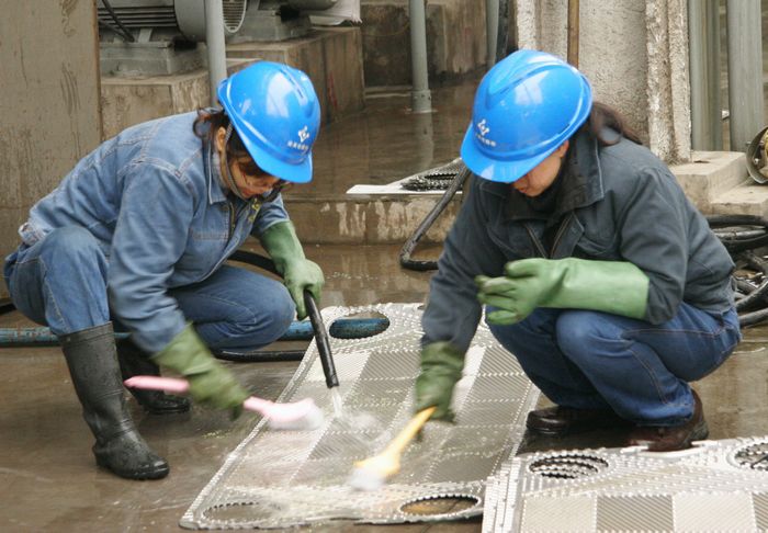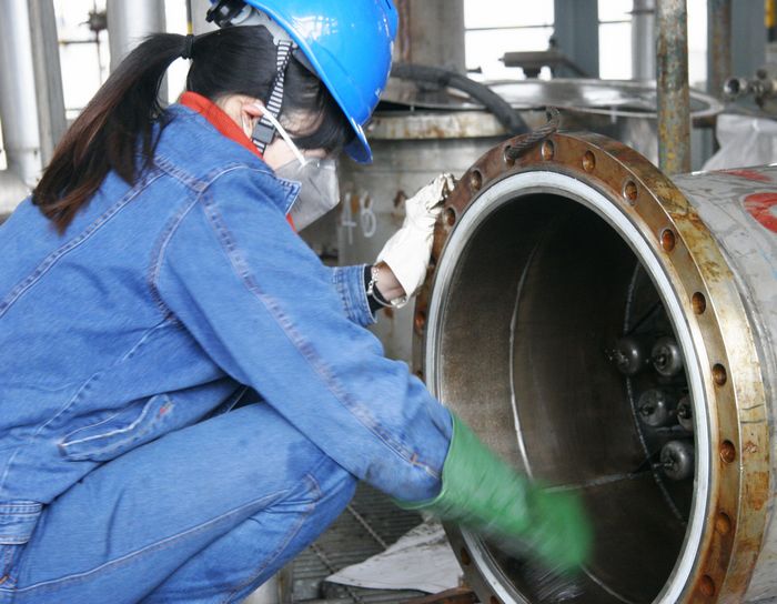 在两万吨聚甲醛装置一楼,工艺二班的员工们正在对E513、C511两设备的填料用磷酸盐浸泡清洗;紧挨着的是工艺一班的员工们对板式换热器E337、E333换热片的清洗工作。聚甲醛作为比较复杂的工艺装置,经长时间的运行,每次的清洗任务都较为繁重,此次大修需要清洗的项目110余项,没有任何外援,全是由车间工艺人员独自完成。