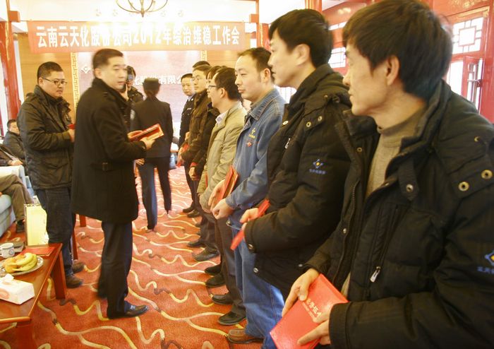 公司党委副书记、纪委书记、工会主席梁洪对云天化集团2012年信访维稳工作的主要精神进行了传达,他要求,公司2012年综治维稳工作一定要与公司生产经营活动、与国家、云南省、集团内重大活动事件、与员工关注的热点难点、与四群教育工作相结合,要有高度的责任感和使命感做好公司的社会治安综合治理工作。