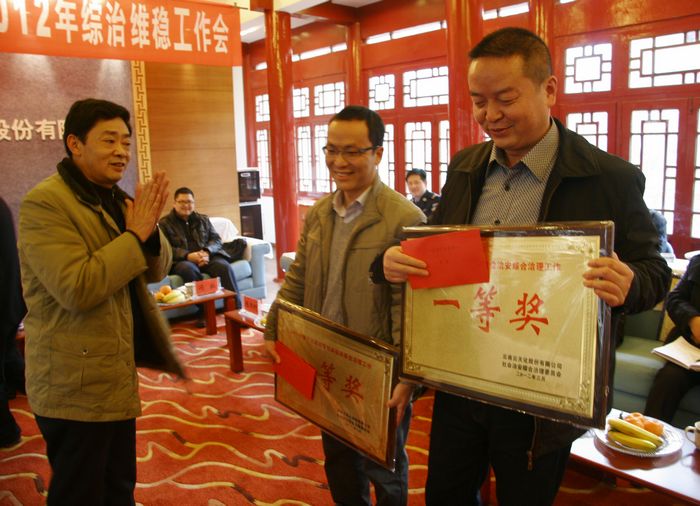 中心化验室、供热车间、检修车间、经营部获“综治维稳工作先进集体”三等奖,水富县副县长张珣、向家坝镇镇长杨文华为他们颁奖