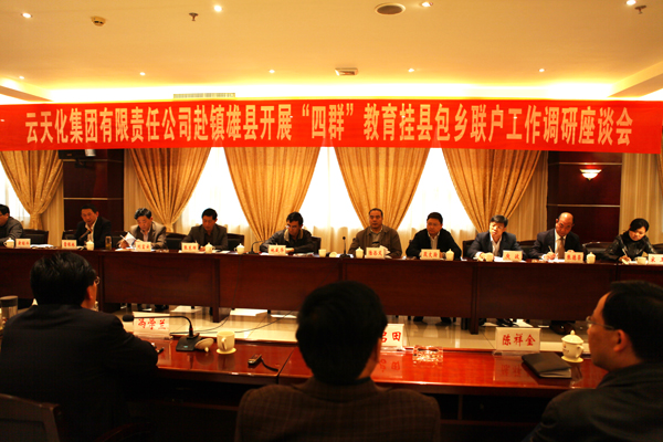 根据中共云南省委开展“四群”教育工作的部署,镇雄县花山乡定为云天化集团党委“四群”教育挂县包乡联户工作联系点。为进一步深入开展“四群”教育挂县包乡联户工作,2012年4月17日,由集团公司董事长、党委书记他盛华为组长的调研组赶赴镇雄县,深入花山乡及各村进行实地调研和民情体验。公司党委书记刘富云及相关部门领导参加了本次调研。