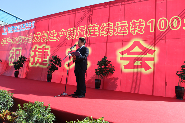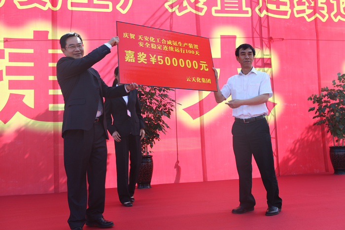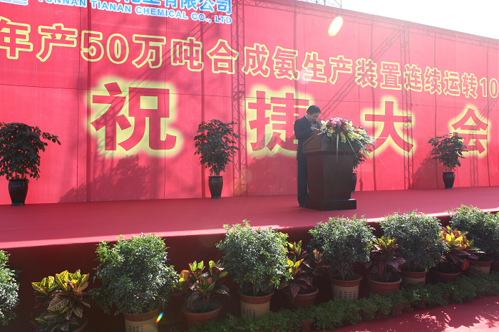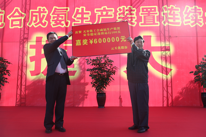 4月19日,云南天安化工有限公司(简称:天安化工)传来捷报--天安化工年产50万吨合成氨生产装置实现了高负荷、连续稳定运行100天的新纪录,这是天安化工建成投产以来的第一个“百日红”。消息传来,令人鼓舞,于4月24日,在安宁草铺化工工业园区天安化工生产区隆重举行年产50万吨合成氨生产装置连续运行100天祝捷大会。