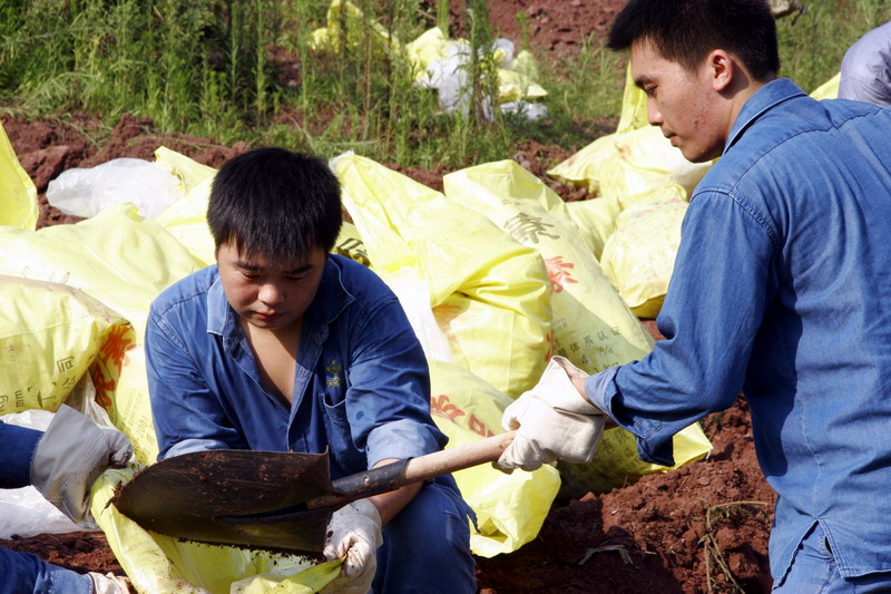 随着编织袋、铁铲的物资工具的准备就绪,抢险队员们迅速行动起来,他们三人一组,在沙土堆放区开始了沙土的装袋工作。一张张灿烂的笑脸,一双双勤快的手,一幅幅齐心协力的画面,无不展现了应急民兵队员们的风采。时间一分一秒的过去,队员们头顶烈日,也顾不得蚊虫的叮咬,不断重复着手中单调而又繁重的动作,他们利用青年人精力充沛的优势,在抢险救灾中发挥了青年突击手的作用。