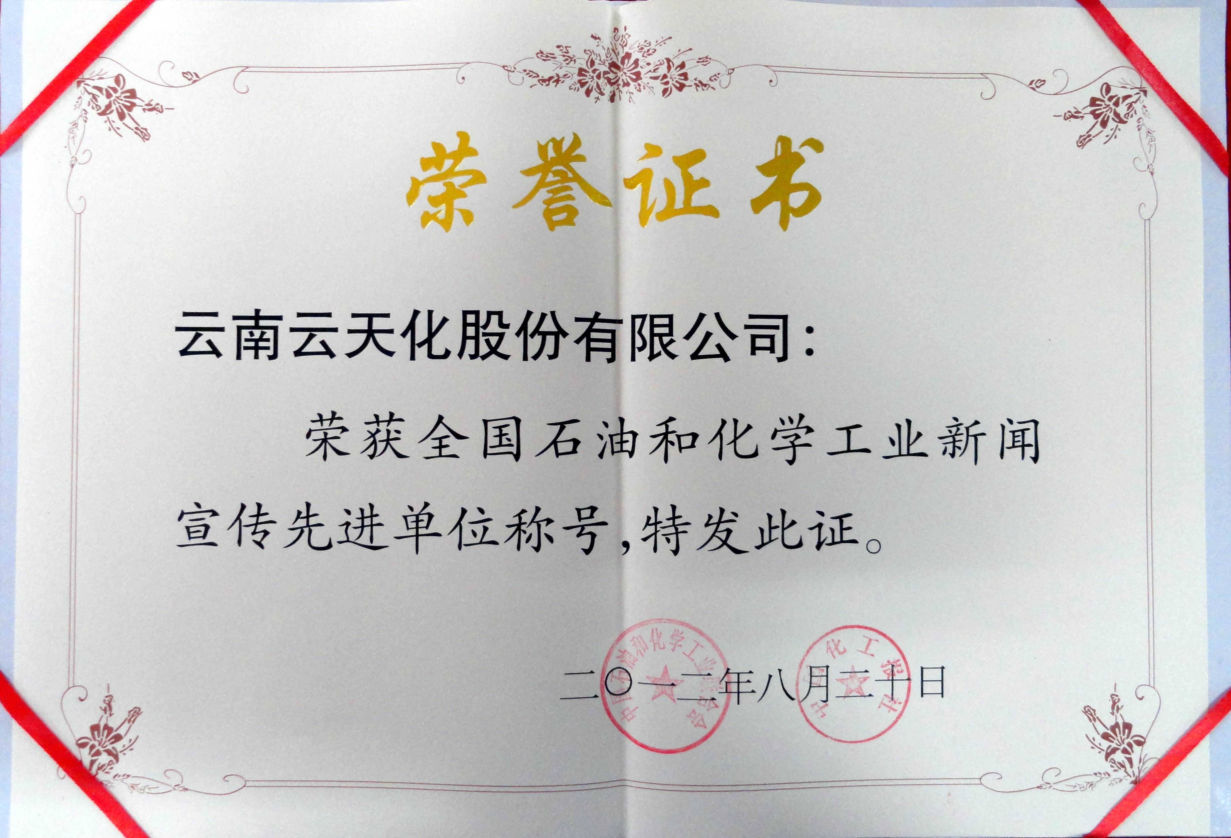 会上,云天化股份公司被授予“全国石油和化学工业新闻宣传先进单位”称号。云天化电视台选送的电视新闻作品《纽米科技:别样征程铸就国内最大最好的湿法锂离子电池隔膜生产线》和电视访谈片《信心的支点》,均被评为“全国石油和化学工业新闻宣传优秀作品”三等奖受到表彰。