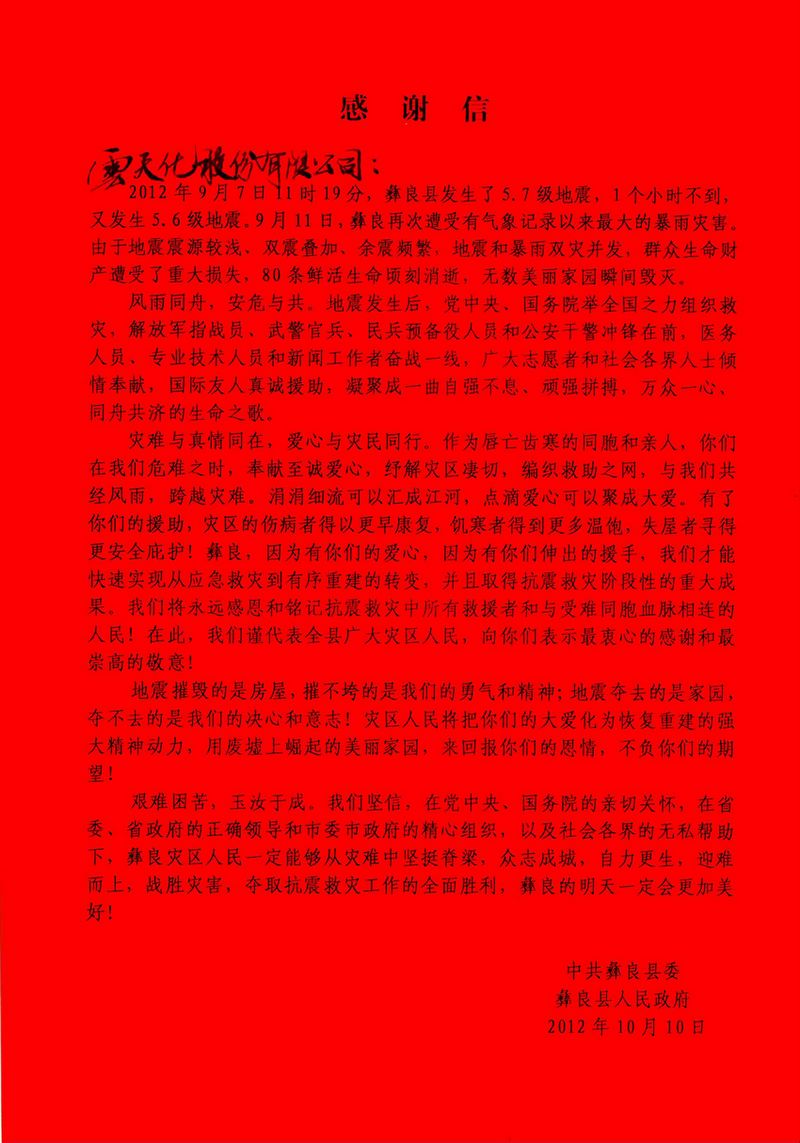 10月19日,公司接到彝良县县委、县政府发来的关于彝良地震捐款的感谢信,感谢信内容如下: