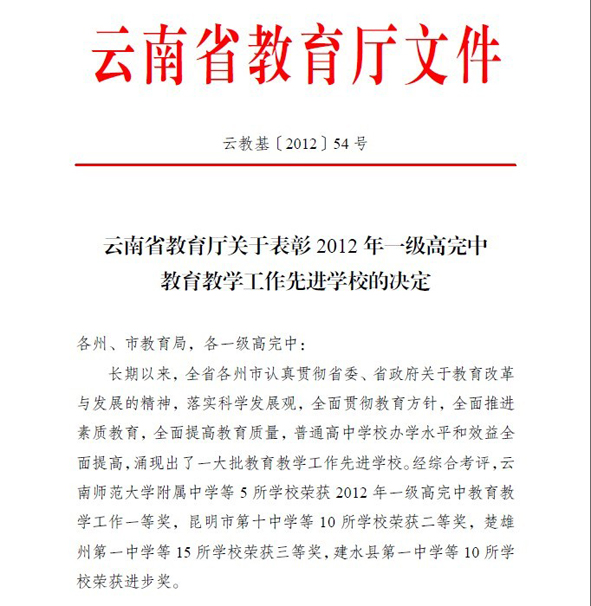 近日,云南省教育厅下文对全省2012年一级高完中教育教学工作先进学校进行表彰。云天化中学获一等奖,名列全省110余所高完中第二。