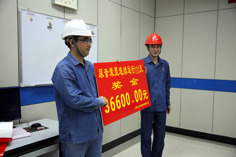 公司常务副总经理、总工程师陈林为尿素车间颁发了奖金,并代表公司对尿素车间、辅助车间及相关单位的辛勤付出表示感谢和慰问。陈林说,尿素装置迎来了第28个“百日红”,可喜可贺。这个“百日红”的实现,凝聚着尿素车间全体员工的汗水和智慧,同时也是我们全体员工团结合作、尽心尽责一直努力工作的结果。希望尿素车间发扬成绩、再接再厉,生产系统全体员工,贯彻精心操作、细心巡检、尽心维护的要求,开好管好公司的所有装置,为公司的发展做出新的贡献。