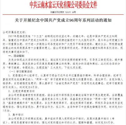 2017年是中国共产党成立96周年,也是推进实施企业“十三五”战略规划实施的攻坚之年、关键之年。隆重纪念中国共产党成立96周年,以优异成绩迎接党的十九大胜利召开,是今年公司党建工作的一项重要主题,对于进一步激励公司各党组织和广大党员干部奋发进取、建功立业,积极营造爱岗敬业的良好氛围具有十分重要的意义...