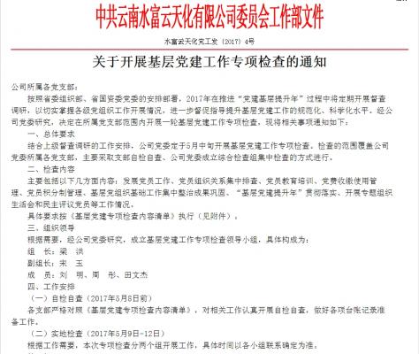 为加强基层党组织建设,切实掌握各级党组织工作开展情况,进一步督促指导提升基层党建工作的规范化、科学化水平,5月9日至17日,公司党委在所属党支部范围内组织开展基层党建工作专项检查。 本次专项检查由公司党委工作部、纪委办公室、团委相关人员组成联合检查组,严格对照《关于开展基层党建工作专项检查的...