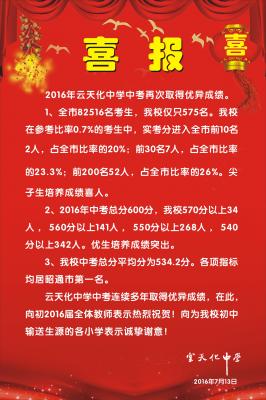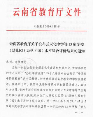 2016年7月7日,省教育厅正式发文,认定云天化中学为省一级一等高完中。