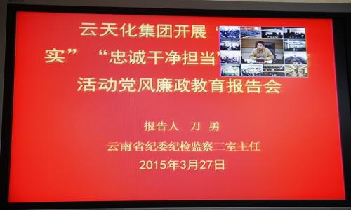 3月27日下午,云天化集团在昆明总部召开了“三严三实”“忠诚干净担当”专题教育活动党风廉政教育报告会,云南省纪委纪检监察三室主任刀勇莅临大会就党风廉政建设以及“三严三实”“忠诚干净担当”专题教育活动做专题讲解,集团董事长、党委副书记他盛华主持报告会。 集团公司领导、集团总部机关中层领导干部;...