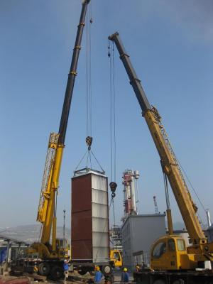 8月18日上午11:30,经过两个半小时的努力,煤代气工程硫酸装置核心设备WSA冷凝器内件成功吊装完成。 WSA冷凝器是降膜式的管壳型玻璃管冷凝器,作用是将SO2转化器出口的气态硫酸冷凝成液态硫酸。其内件由丹麦托普索公司负责制造,主要由两个模块构成,每个模块包含1008根7米长的玻璃管。为了...