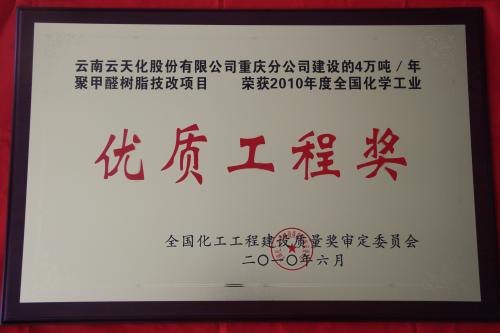 2010年6月,云天化股份重庆分公司4万吨/年聚甲醛树脂项目荣获2010年度全国化学工业“优质工程奖”,全国化工工程建设质量奖审定委员会向云天化股份重庆分公司颁发了奖牌和证书。 4万吨/年聚甲醛树脂项目是云天化股份重庆分公司6万吨/年聚甲醛树脂项目二期工程,2008年4月19日正式开工建设。...