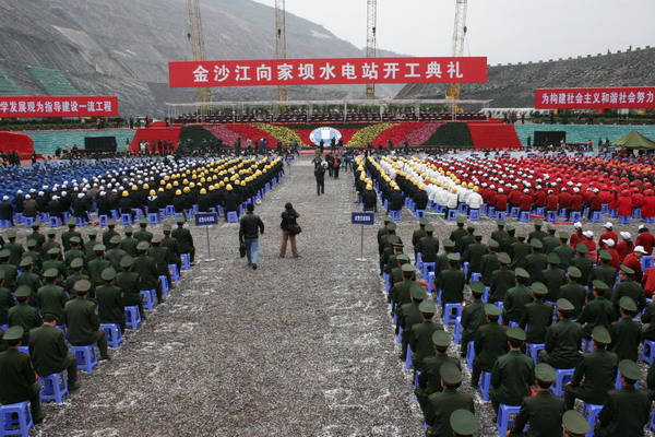 “我宣布,金沙江向家坝水电站正式开工!”26日上午10点17分,中共中央政治局委员、国务院副总理曾培炎话音刚落,震天的礼炮声响彻金沙江两岸。我国第三大水电站――向家坝水电站正式拉开建设大幕。开工典礼在川滇两省交界处坝址左岸施工区围堰基坑举行。高高悬挂的气球,迎风招展的彩旗,以及整齐划一的方队,将会场...