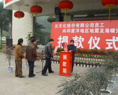 五洲四海来相助,一分一毫寄深情。元月14日,公司工会举行隆重的捐款仪式。公司28个单位3000余名员工共捐款80000余元,向印度洋地区地震、海啸灾民,表达了云天化人的一片深情。上午11:00,捐款仪式在公司工会大楼门厅前举行。参加捐款仪式的有公司党委副书记段文瀚、工会主席公司工会领导,以及包括重庆...