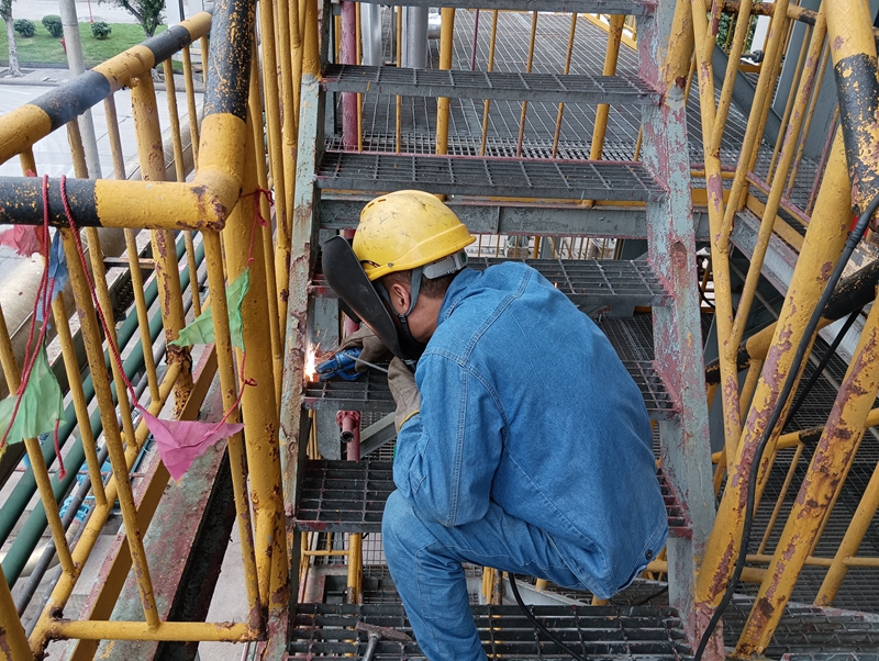 由于楼梯梯子踏板底部焊缝脱开,楼梯梯子踏板整改是通过在上下楼梯护拦底部加固,不仅可以防止人员不慎踩空,出现不必要的事故,也可以防止检修时,检修物件掉落到楼下。甲醇当班工艺员工和装备运维中心都分别安排一名人员对其进行现场监护,在动火作业时,可能会火花飞溅,所以工艺人员在硫酸装置整改附近进行安全措施一一核实后,方才才能进行动火作业。