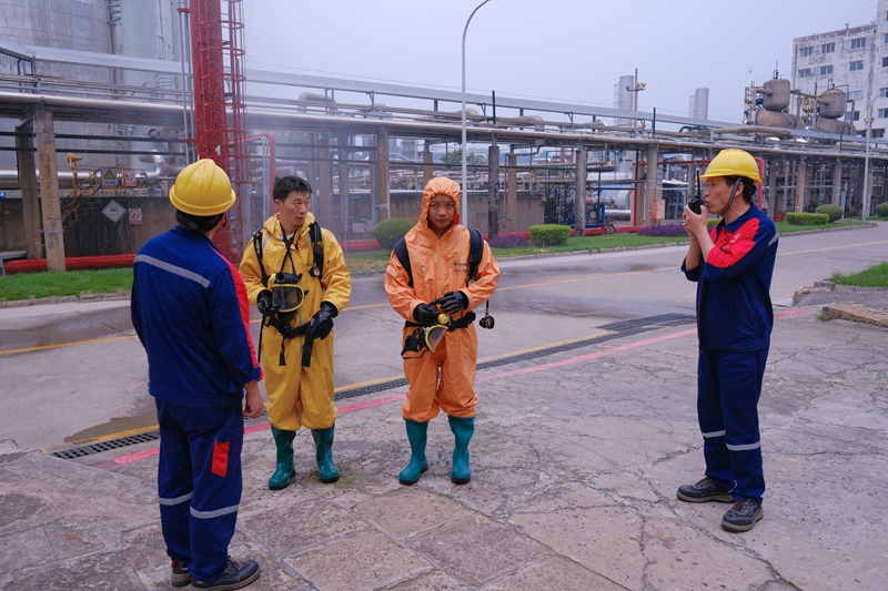 为提高员工对事故的应急处置能力和协调作战能力,6月22日化肥车间利用“安全月”活动契机,组织开展了合成装置液氨储罐(120FA)出口法兰泄漏事故应急演练。