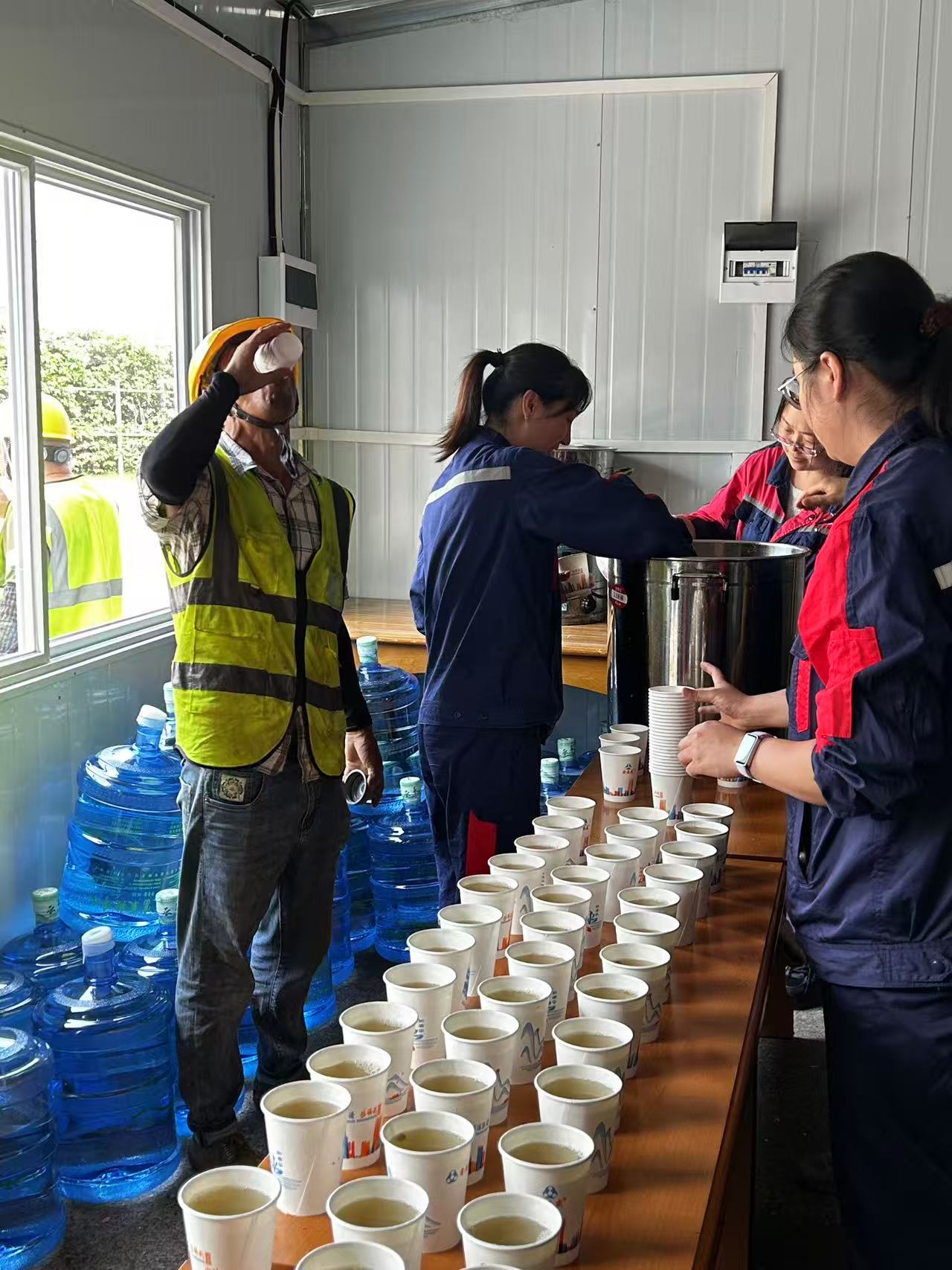 “师傅辛苦了,喝杯绿豆汤解解暑吧!”“苦丁茶马上就来!”一句句亲切的问候,一杯杯清凉的茶水,不仅缓解了检修人员的疲惫,更传递着公司对员工的关怀与温暖,送水服务队根据检修进度与天气情况,科学的规划饮品种类和送水时间,确保每位员工都能喝上干净卫生的饮用水。