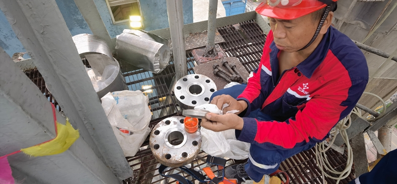 在大修领导的带领下,大修一线的员工们克服了炎热、雷雨天气等检修困难。截至今日8月29日上午,化肥装置尿素水解蒸馏塔C-1在线流量计完成更换;化肥装置尿素DCS卡件、线路、箱柜更换正在加班加点火热进行中,计划15天完成;高压甲铵泵301-J/JS/JA至高压洗涤器203-C的管道法兰更换等系列重要检修任务均如期优质开展。