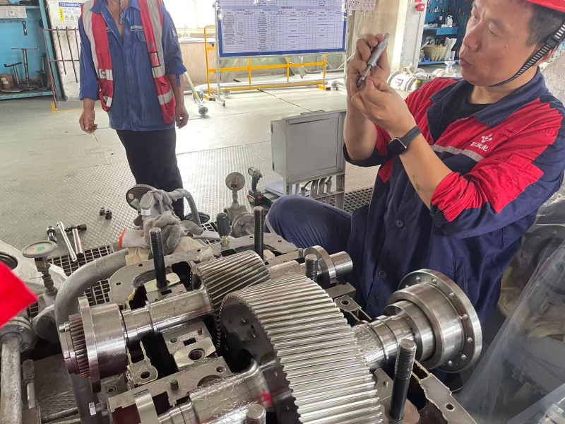 在核心部件检测与修复上,作业内容覆盖多维度。一方面,细致检查齿面啮合状态与磨损程度,清除机件和齿轮内油垢污物,检测齿轮轴颈圆度与圆柱度并按需修整,同时严格检测两齿轮轴平行度与水平度,保障传动系统精准运行;另一方面,完成轴承、油封的检测、修理及更换,检查止推盘磨损情况并测量端面跳动,全面排查旋转部件隐患。