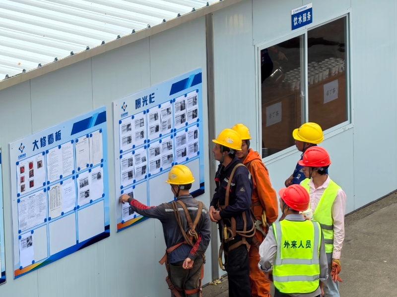 8月31日,化肥装置大修来到第五天,大修曝光栏前出现令公司所有安全管理人员欣慰的一幕。外来人员借休息时间讨论学习大修曝光栏安全行为内容。