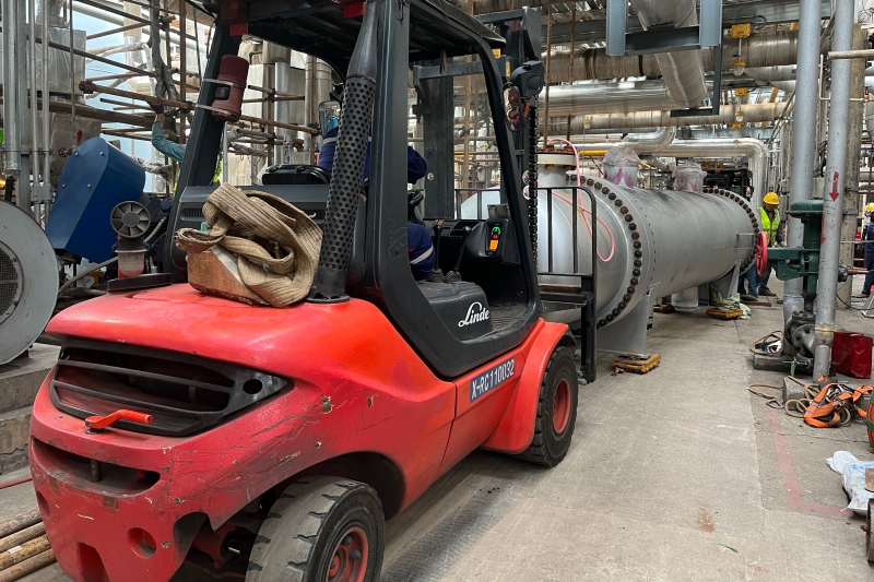 合成氨装置更换103-C换热器是本次大修的重要项目之一。8月30日旧设备103-C成功拆除后,新设备运到设备安装位置也是一件很重要的步骤,因合成氨装置103C换热器的位置处于整套装置的较中心位置,并且处于管廊架的正下方,设备头顶布满设备和管道。吊车等起重设备不具备现场吊装作业条件,只能采用起重、葫芦等工具,叉车和全人工配合模式将设备运送到安装位置。
