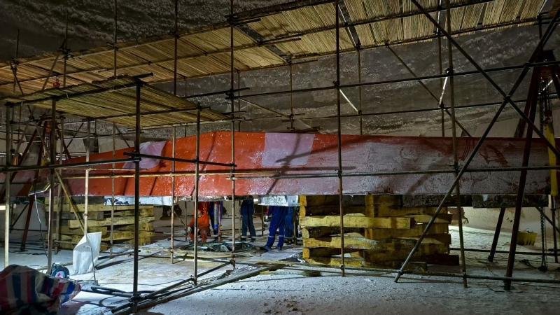 尿素刮料机检修现场。检维修人员与起重工高效协作,顺利完成设备的拆卸与吊装工作,随后用枕木稳稳支撑起两段机体,为检修人员搭建起安全的作业平台,有效规避了潜在风险。