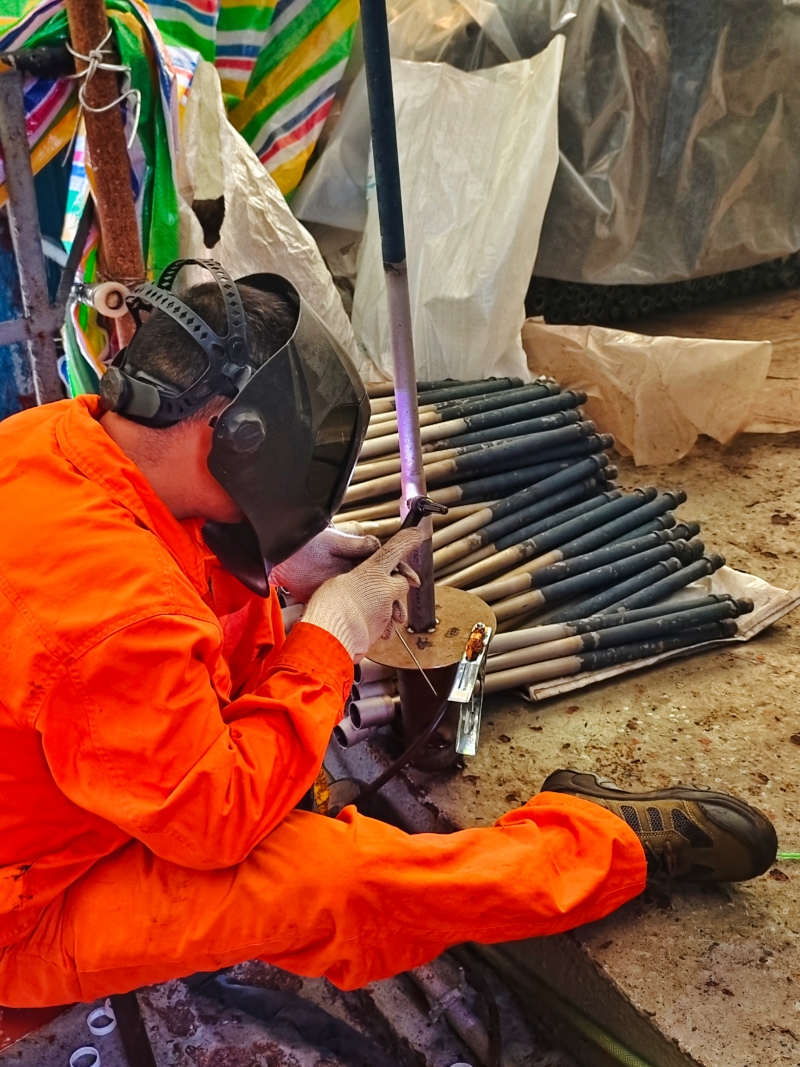 该汽提塔作为尿素生产系统的“心脏”,承担着关键工艺介质的高效处理任务。本次检修中,装备运维铆工要配合检测站对塔内2597根汽提管逐根进行气阻测试与全面检查,通过检查发现有423根管道存在腐蚀缺陷。面对管道分布密集、作业空间狭小的挑战,铆工施工点长廖发和带领团队精准施策,在铆工与焊工紧密配合,凭借过硬技术高效完成补焊修复及气体管吹扫工作。