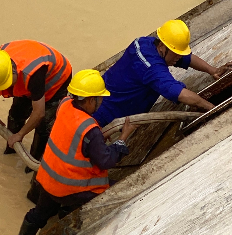 早上8:30分,作业人员准备好水枪等工具,在负责人交代安全工作后,冲洗工作全面铺开。由于浓缩区、反应区积泥较厚,尾水系统返水浊度严格控制等因素,给冲洗工作增加了难度,可作业人员面对困难,从容不迫,从池壁到池底逐一冲洗着。